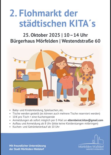 Zum zweiten Mal organisiert der Elternbeirat der Kita V Heidelberger Straße gemeinsam mit der Stadt einen großen Flohmarkt im Bürgerhaus Mörfelden. Neben allen städtischen Kitas können auch andere Anbieterinnen und Anbieter sowie freie Träger und deren Eltern mit einem eigenen Stand teilnehmen.