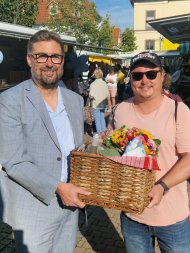 Der vollgepackte Korb vom Mörfelder Wochenmarkt hat 9,550 Kilogramm gewogen. Am nächsten dran war Christian Holzapfel. Während des Aktionstags in Mörfelden konnte er den Gewinn in Empfang nehmen. Hier sieht man ihn zusammen mit Bürgermeister Karsten Groß (links). Noch einmal: Herzlichen Glückwunsch!