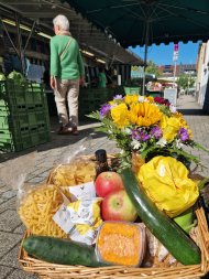 Mit Unterstützung der Walldorfer Marktstände wurde ein Korb gepackt und die Frage lautet: Was wiegt der Korb samt Inhalt?