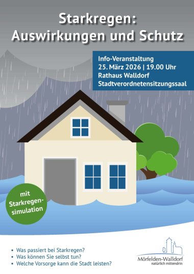Vollgelaufene Keller, überflutete Straßenzüge und Feuerwehreinsätze waren in Mörfelden-Walldorf in den letzten Jahrzehnten Folge von Starkregenereignissen. Die Stadtwerke haben daher eine Starkregensimulation durchführen lassen. Am Mittwoch, 25. März, werden die Ergebnisse öffentlich vorgestellt und zugleich Hinweise zur Vorsorge gegeben. Die Veranstaltung findet im Rathaus Walldorf statt und beginnt um 19 Uhr.