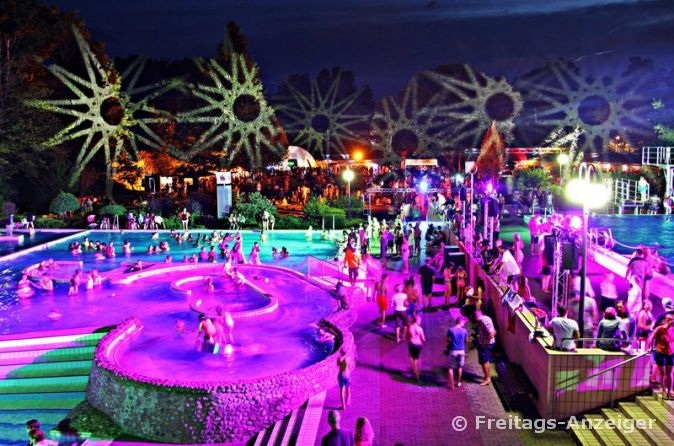 Schwimmen bis Mitternacht - Hüpfburg - Essens- und Getränkestände der Vereine - veganer Essensstand - Foodtruck - DJ in allen Beckenbereichen - Karaokeshow mit AGA (Agatino Sciurti, "Aga's"), Arschbombencontest,... und noch viel mehr.