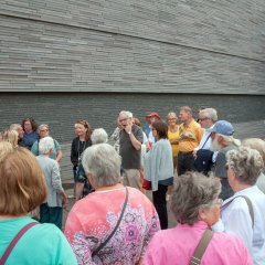 Die Stadtführung am Vormittag hatte an der „Schlachthoframpe" begonnen – dem Ort, an dem im Jahre 1942 zwei große Deportationen von nahezu 900 zu diesem Zeitpunkt noch in Wiesbaden wohnenden Jüdinnen und Juden in die Vernichtungslager des Ostens stattfanden. Rund 3.000 Juden lebten 1933 in Wiesbaden. Viele hatten die Stadt rechtzeitig verlassen können. Mehr als 100 verübten Selbstmord, als sie von den Deportationen erfuhren. Über 1.500 Wiesbadener Juden wurden während der NS-Zeit ermordet. An sie erinnert seit 2011 die Gedenkstätte am Michelsberg, dem Ort, an dem seit 1869 eine der schönsten Synagogen Deutschlands gestanden hatte, bis sie 1938 im Rahmen der „Reichspogromnacht" von Schlägertruppen zerstört und niedergebrannt worden war. Nach 1945 kehrte lediglich ein Dutzend Juden nach Wiesbaden zurück. - Die Stadtführung führte auch zu Orten der damaligen Täter – so zum Beispiel an das heutige Wirtschaftsministerium, das von 1933 bis 1945 das sog. Rasse- und Erbgesundheitsamt beherbergte, das sich mit der Ermordung behinderter Menschen befasste.